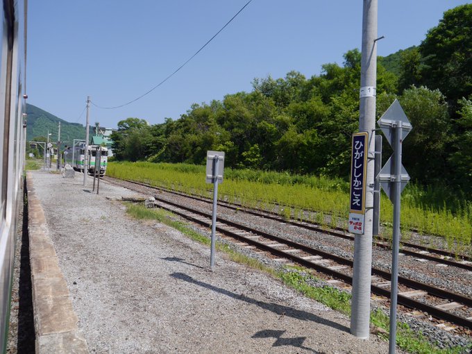 posted at 11:54:28東鹿越で対向列車と待合せ。 大きな採石場とかなやま湖に囲まれた駅。 pic.twitter.com/3UzXSBKO8e